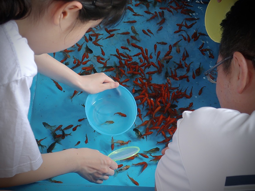 What’s going on at the end of the long line snaking all around the Edogawa central park’s swimming pool? It’s the catch-your-own-goldfish tent!
