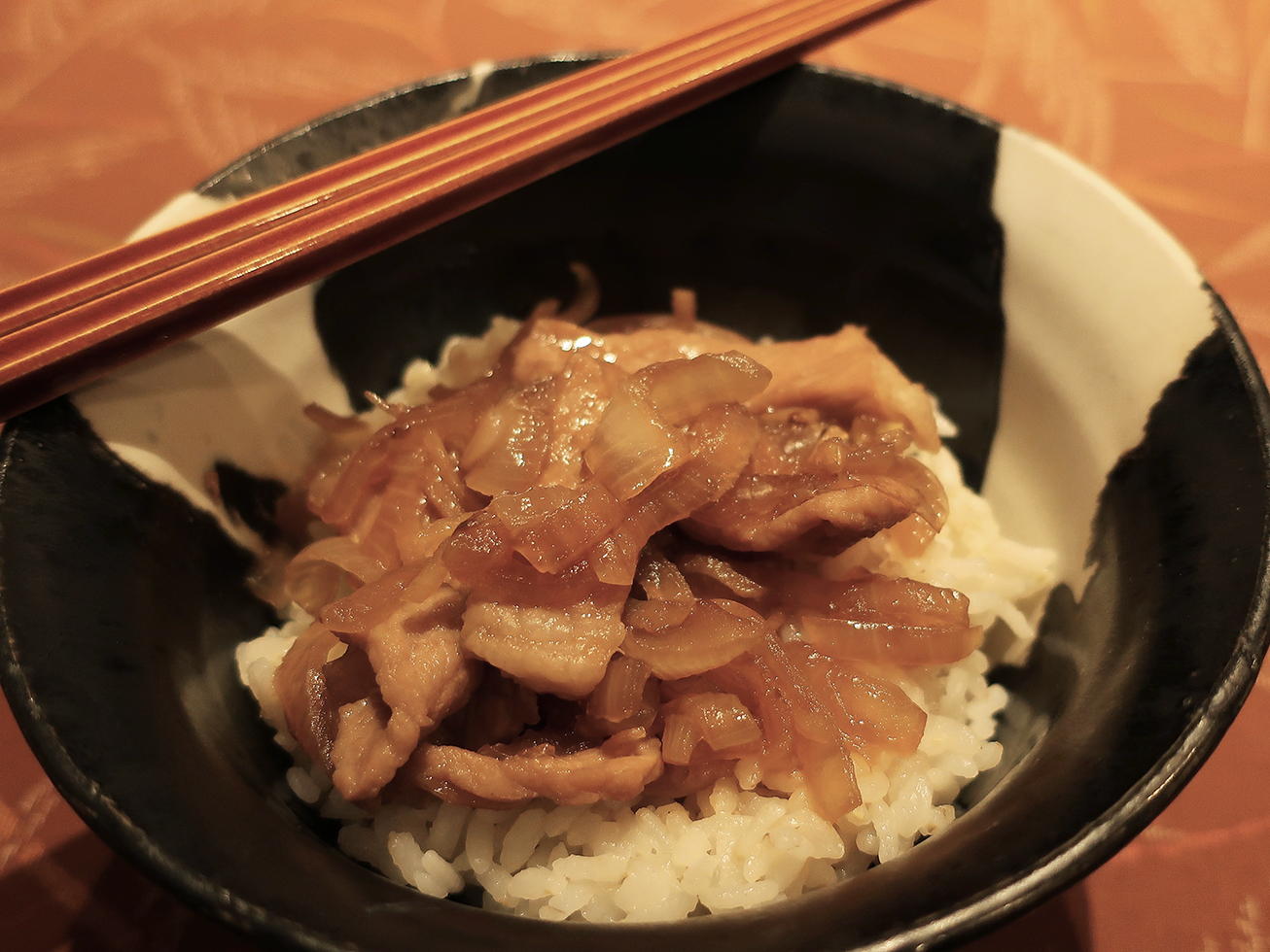 Pour mirin, sake, soy sauce and sugar into the frying pan and stir together. Bring it to a boil and let it simmer on low, uncovered, for three minutes. Add the sauteed onion and the raw ginger and bring to a simmer.