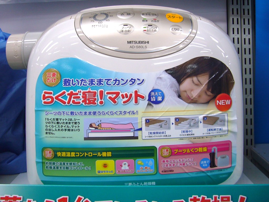This lovely invention I believe is what we called ” fukin” in our Japanese household: a futon and bedding dryer, heater or cooler , double down as a clothes dryer or even shoes and boots fryer with another attachment. It basically blows air through the hose into a nylon fabric envelop , that is inserted between the futon and covers. It can be used with hot air or not. The purpose is to evaporate the absorbed humidity and warm the bedding, making it more comfortable, fluffy and cozy to sleep. With another nylon envelop / garment bag this little invention becomes a dryer to clothes hung on hangers or a drying rack with small items, like socks and underwear.
