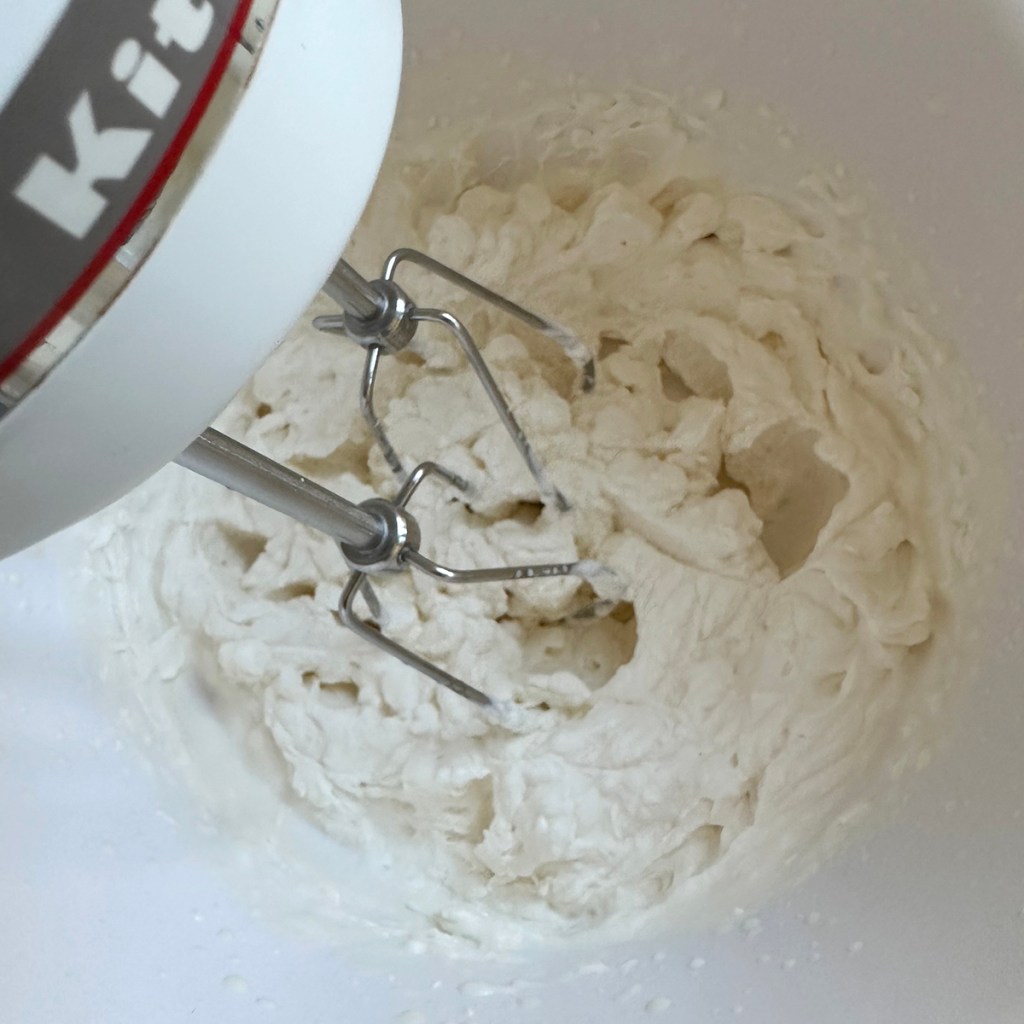 Whip cream, powdered sugar and vanilla in a small bowl until slightly beyond stiff peaks. It should look like this: