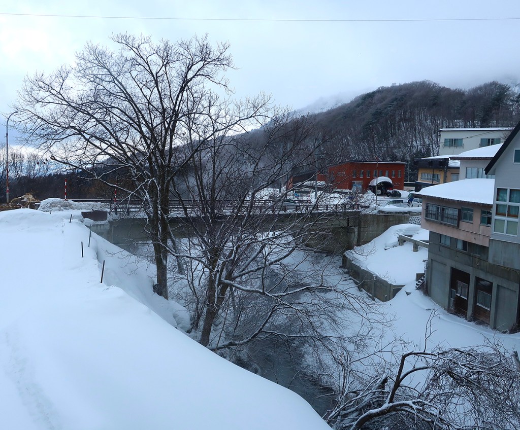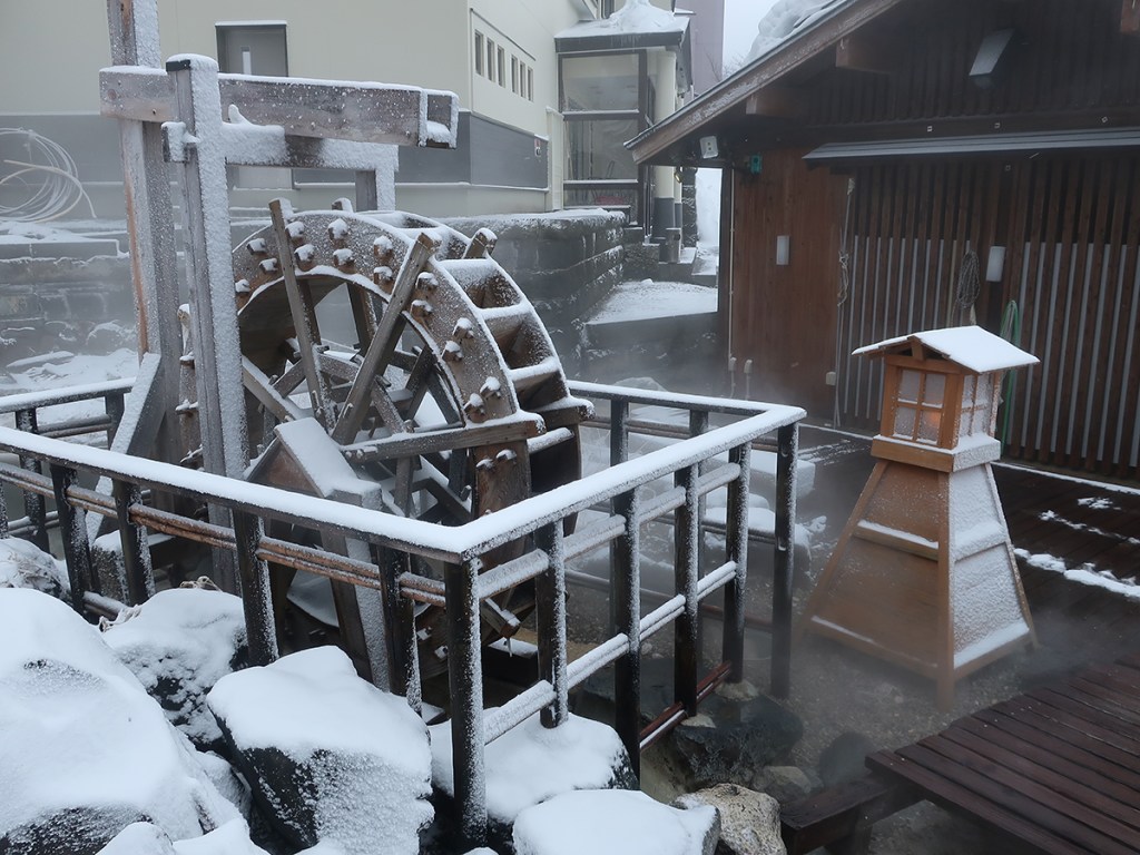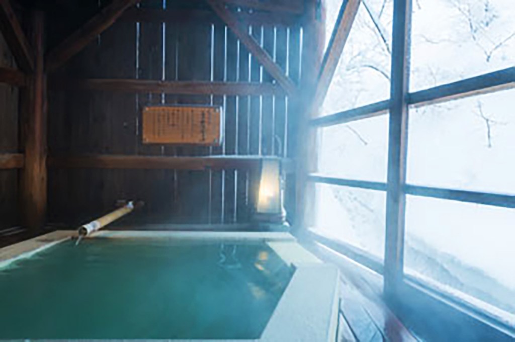 and soak away your aches and pains in a steamy natural hot spring that’s open to the fresh air and snowy outdoors…