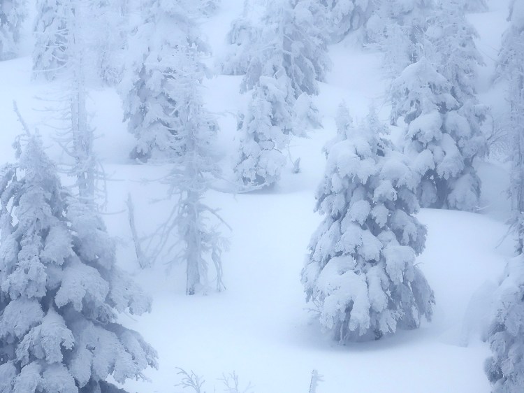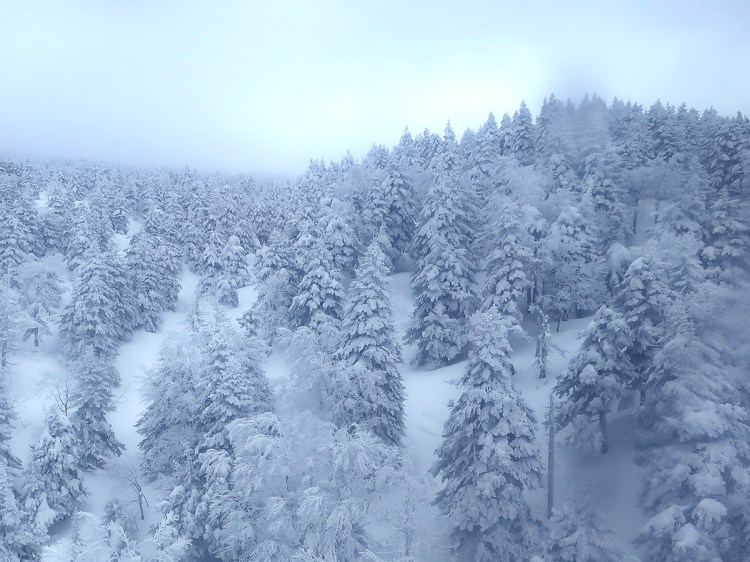 Once aloft, the view is spectacular. The mixed forest of conifers and deciduous trees instantly underscores that the conditions on this mountain are special, because every twig and branch isn’t outlined in fallen snow, it’s enrobed in frozen fog.