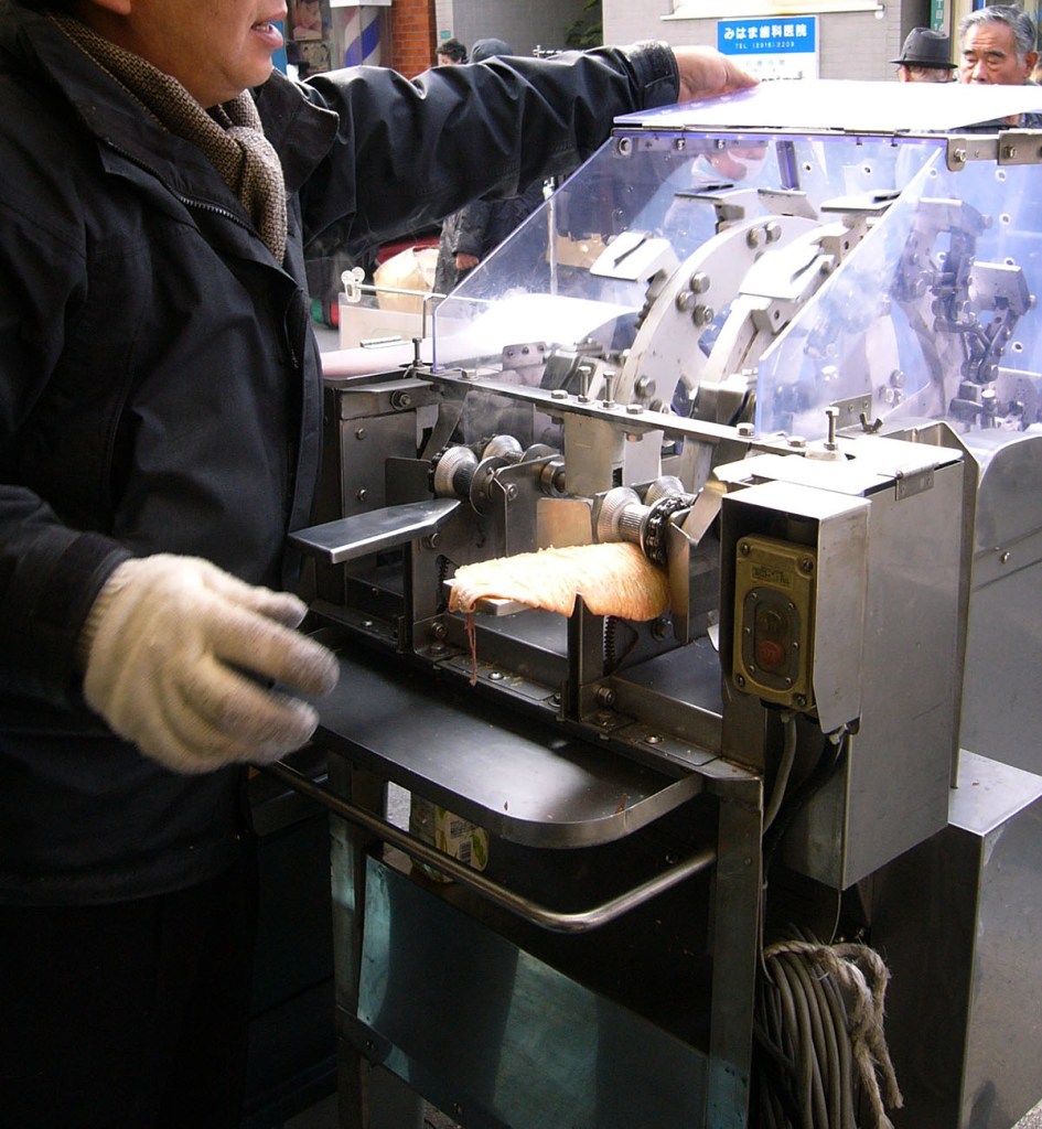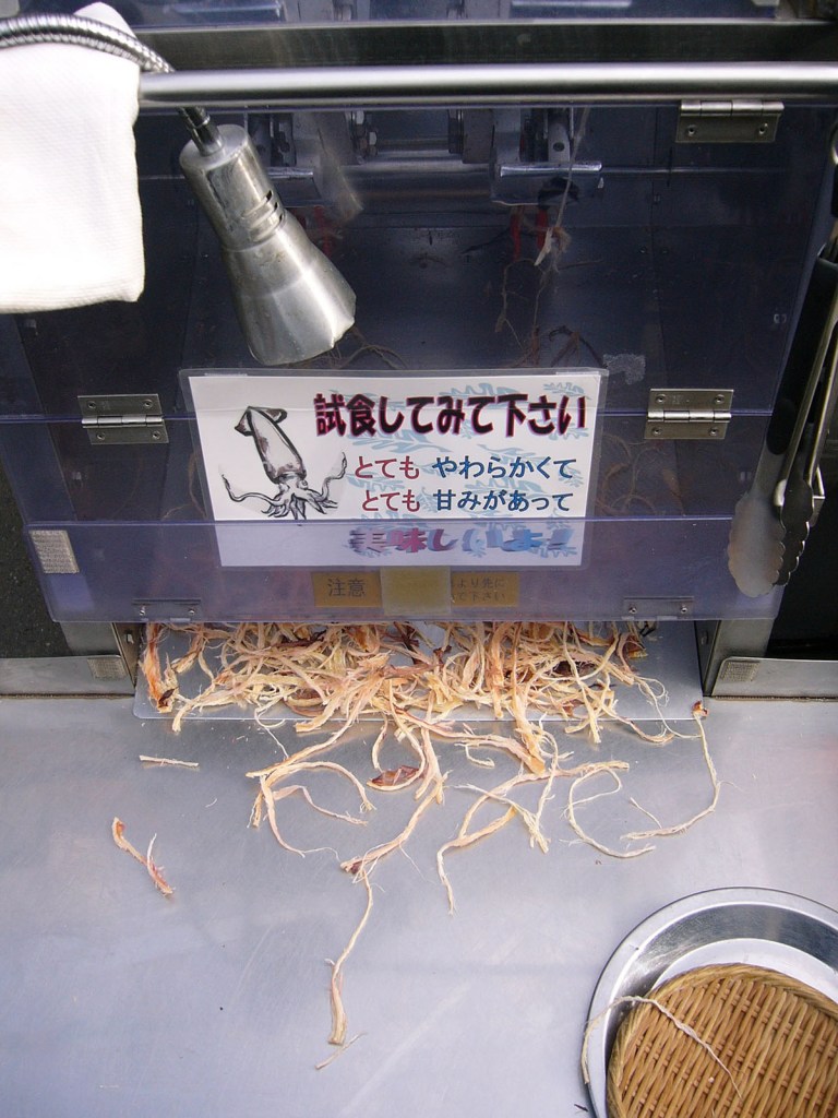 Where you also might encounter a vendor doing the equivalent of making Oreos from scratch: feeding freshly-grilled cephalopod into the top of the squid transmogrifier…