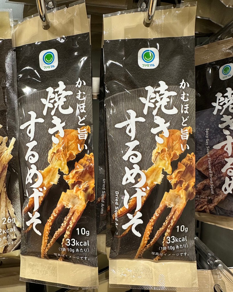 *True story: The first time I lived in Japan, I sent a care package to a friend who used to live in Tokyo and was starting her freshman year of college. It contained all the conbini snacks I knew she missed, plus a bonus pack of dried squid tentacles, just to squick out her new roommates. Little did I know that she actually likes squid snacks (gonna be honest here, they are not un-tasty, once you get past the fact that they are SQUID). They laughed in horror, then she tossed them in a drawer (they keep forever) and when finals rolled around, she was so busy cramming day and night, she didn’t manage to pack or eat until right before she had to jump on the plane to go home for winter break. She stuffed the pack of squid snacks into her carry-on, but didn’t have time to crack them open until she was on the plane. Which was a mistake. Because one more thing about squid snacks? They’re pungent. Not to be eaten around people who aren’t big squid snack fans themselves. Especially not on a crowded airplane, where you become Passenger Non Grata Number One in the time it takes everyone for three rows around you to whisper to each other, “What is that awful smell?”