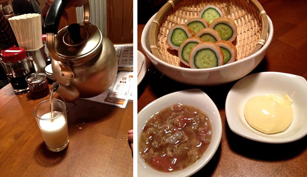 which might come in a charming chilled teakettle, but will definitely come with a little appetizer you didn’t request. (Do not even try to stop them. Even native speakers are unsuccessful at refusing the ¥300-¥500 o-tsumami** that comes with any drink order and is added to your bill whether you eat it or not.) Chances are, your travel buddy will regret passing on the tame grilled version when faced with a bartender staring them down for being a wussy foreigner who’s not slurping down that little dish of marinated squid guts.