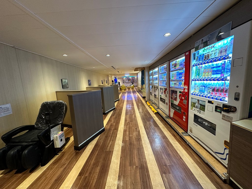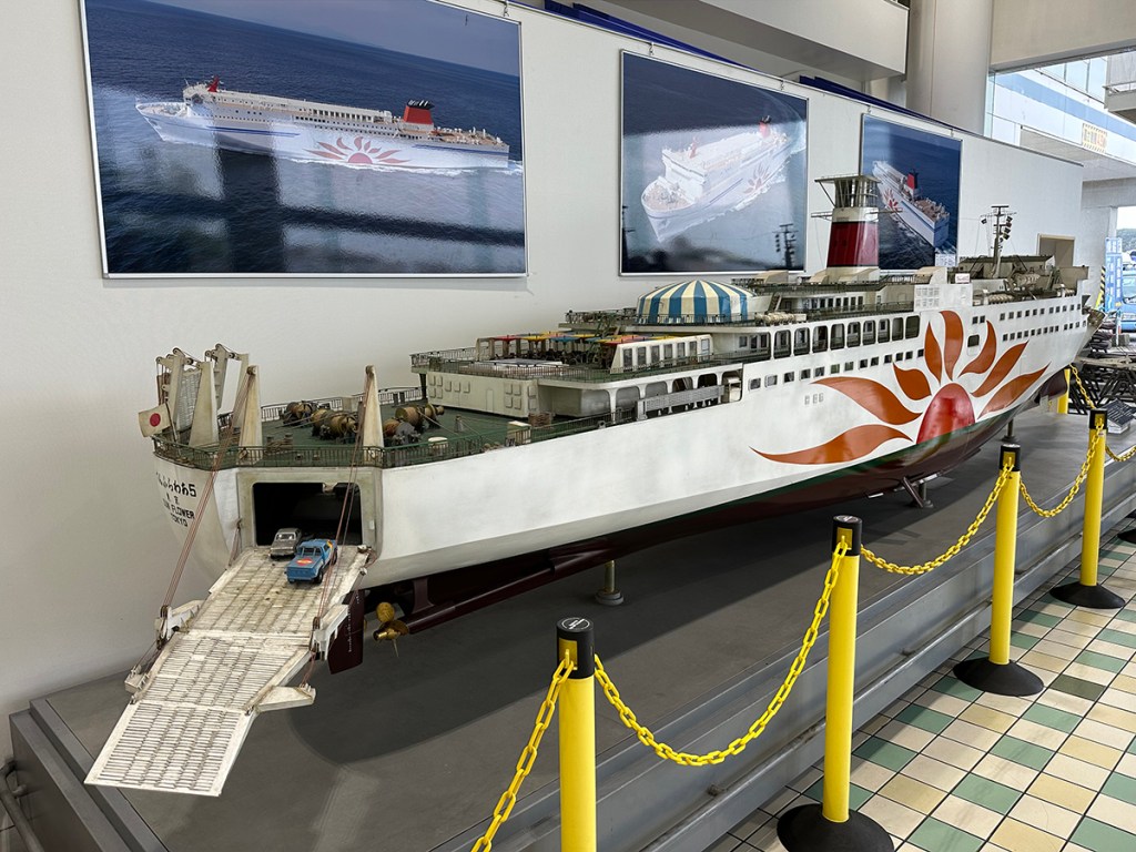 most of those who ride the ferry are long-haul truckers, who drive their loaded rigs into the hold, then sleep in a giant shared tatami room, using the paid facilities on board for eating and entertainment. Check out the ship model to see where the trucks drive in below, and the row of big “windows” at the top of the boat mid-ship where the fancy cabins are.