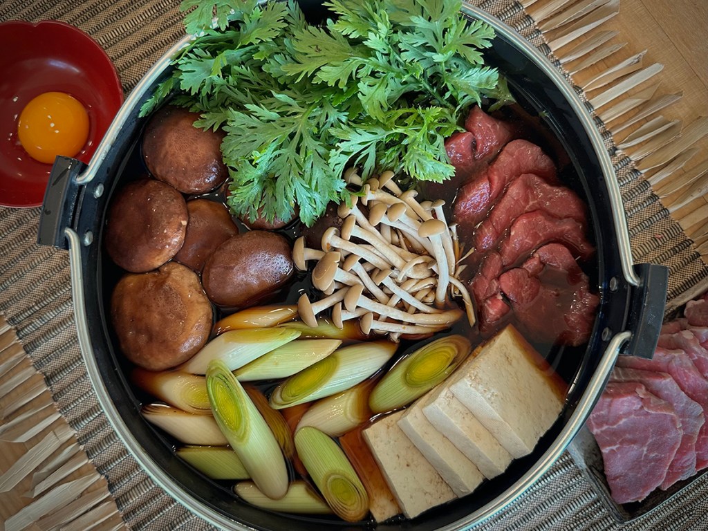 Sukiyaki is traditionally served with a lightly beaten raw egg in a small side bowl at each seat, to use as a dipping sauce for the hot meat, tofu and vegetables. If you’re uncomfortable with that, you can leave it out, but as it combines with the sauce on the meat and veggies it does add a deep & authentic-tasting savoriness.