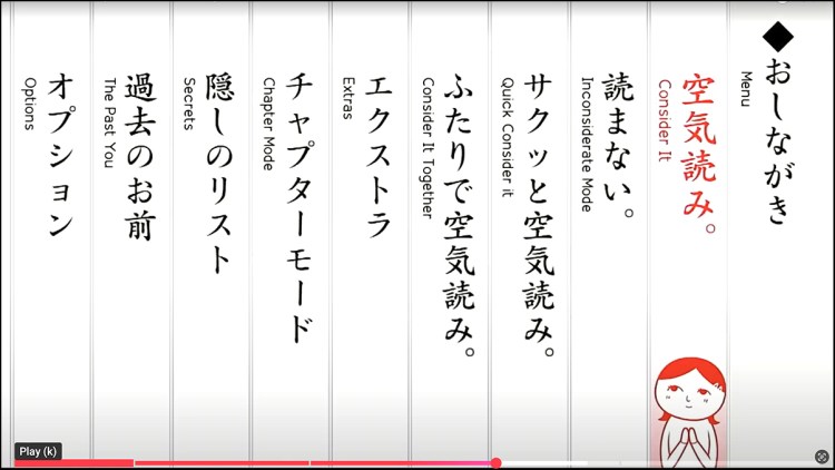 Kūki Yomi presents thirty situations in which the player has to choose how to react. Some situations are so universal it’s easy to maneuver your character into doing the obviously right thing before the next situation pops up