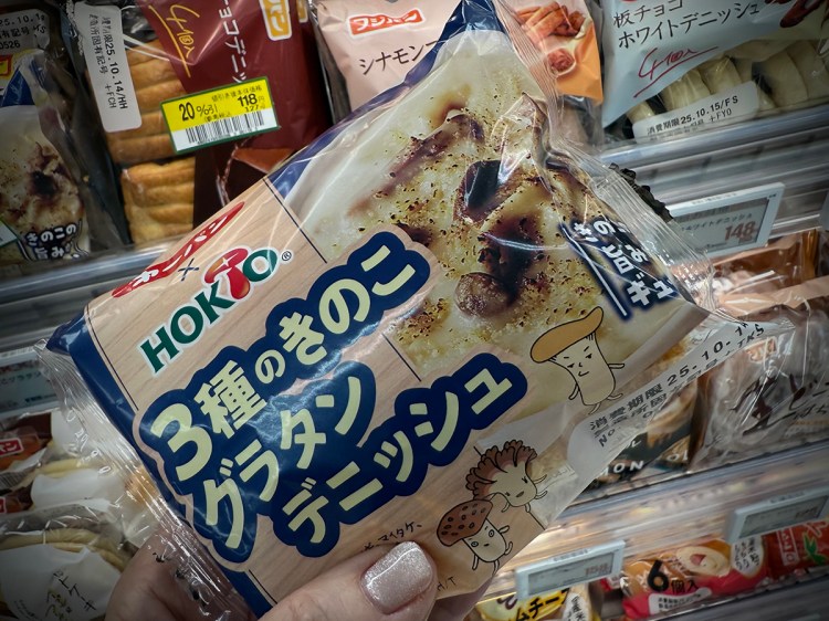 On the other hand, if your tastes run to Chez Billionaire but your budget is more 7-11, what about this “3-mushroom gratin danish”? (If I couldn’t read the package, I’d be quite glad of those little mushroom mascots on the front, because the product photo lends itself to far more unsavory interpretations. Food Styling Fails of Japan: it’s a Thing.)