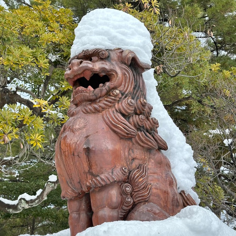 Even the lion dogs grow snow mullets of epic proportions!
