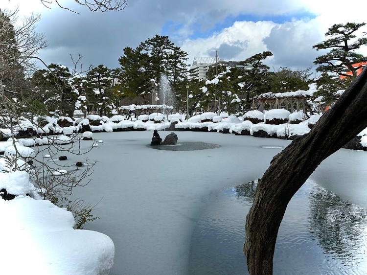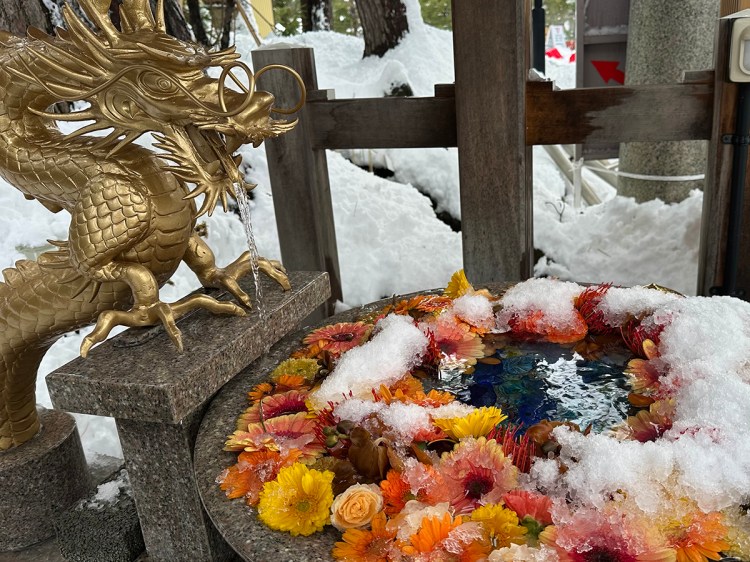 A golden dragon and a snow-frosted hanachōzu water basin filled with flowers greets you as you stop to purify your hands before entering…