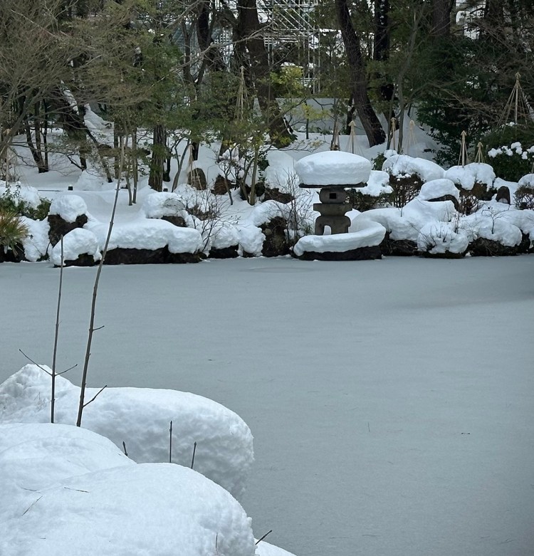 and the red bridge crossing the garden’s frozen stream looks even prettier heaped with snow up to its railings