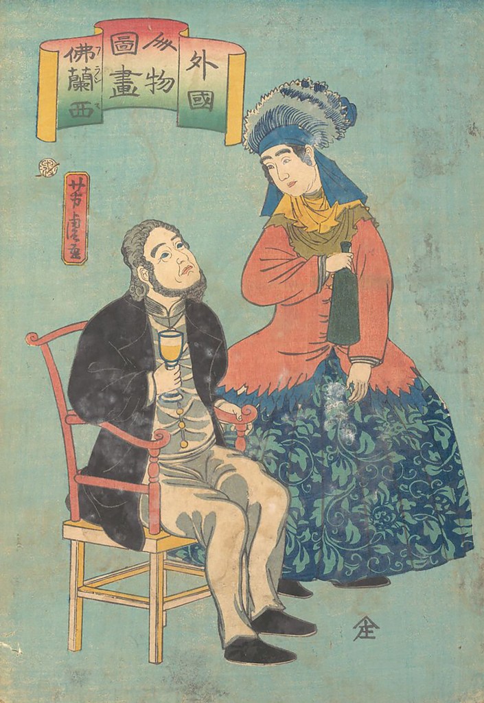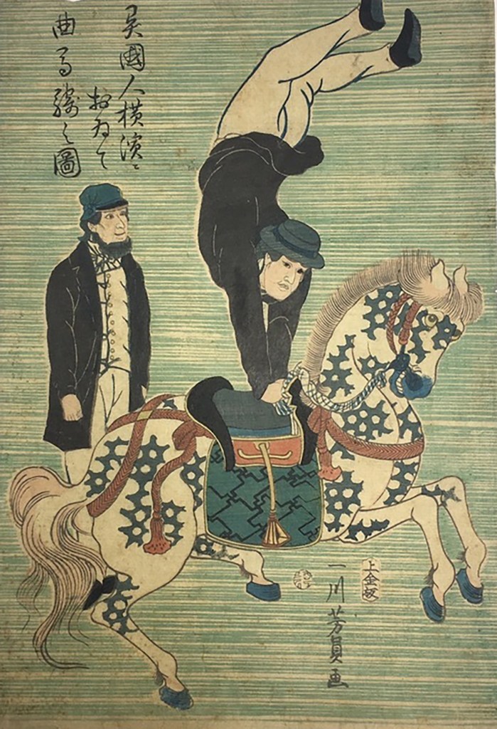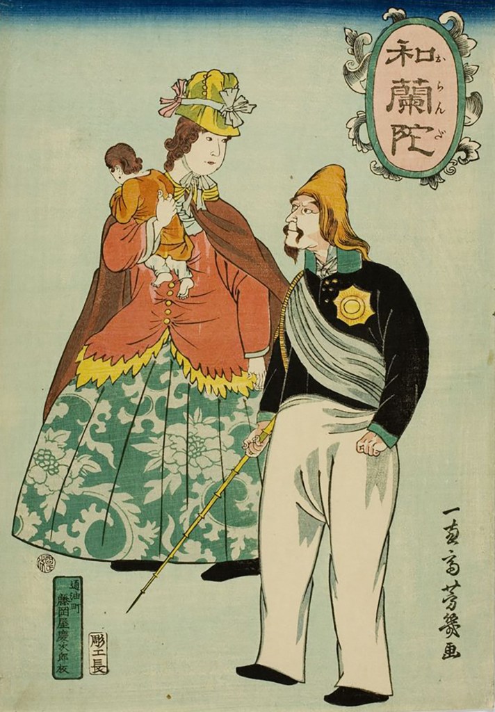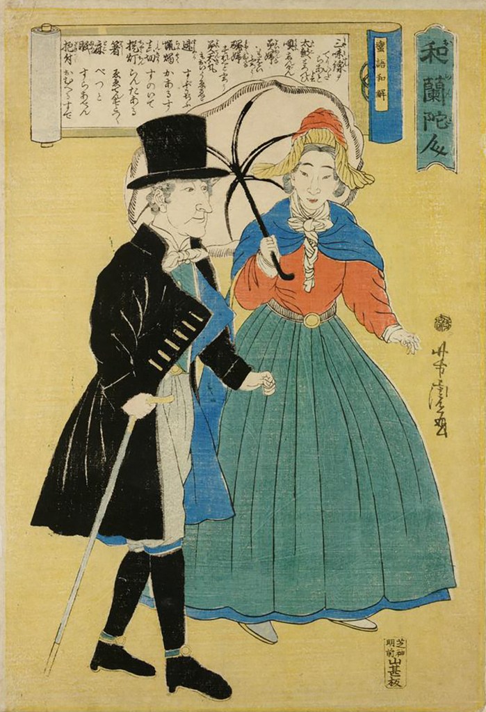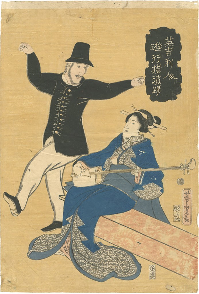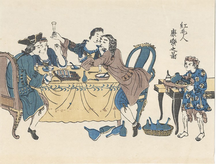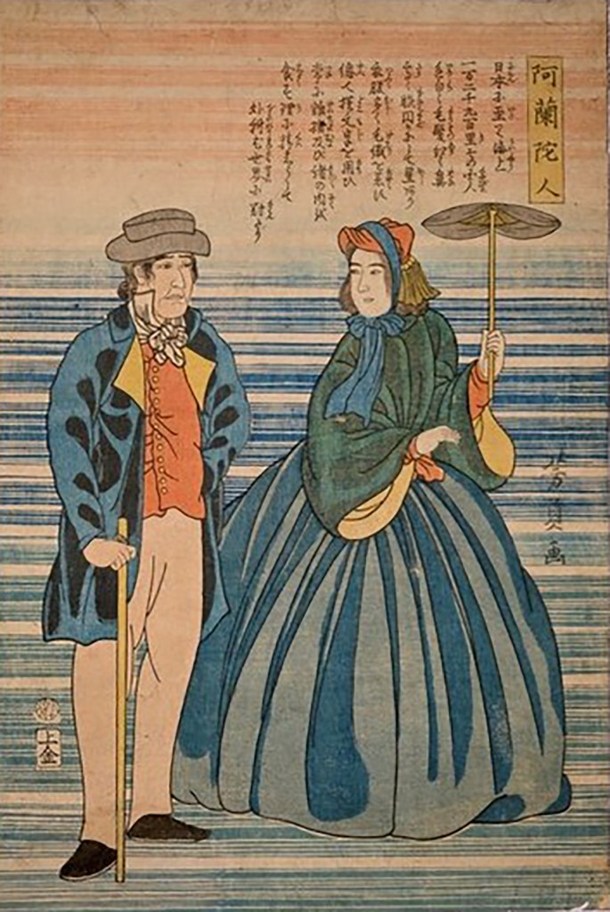 As you can imagine, catching sight of these strange beings kindled intense curiosity in ordinary citizens. Always looking for the next big opportunity, entrepreneurial woodblock artists took a break from painting the top courtesans, sumo wrestlers and actors of the day, and trekked across the Dejima bridge to sketch the outlandish appearance and customs practiced by the foreign barbarians. Needless to say, they made a killing.