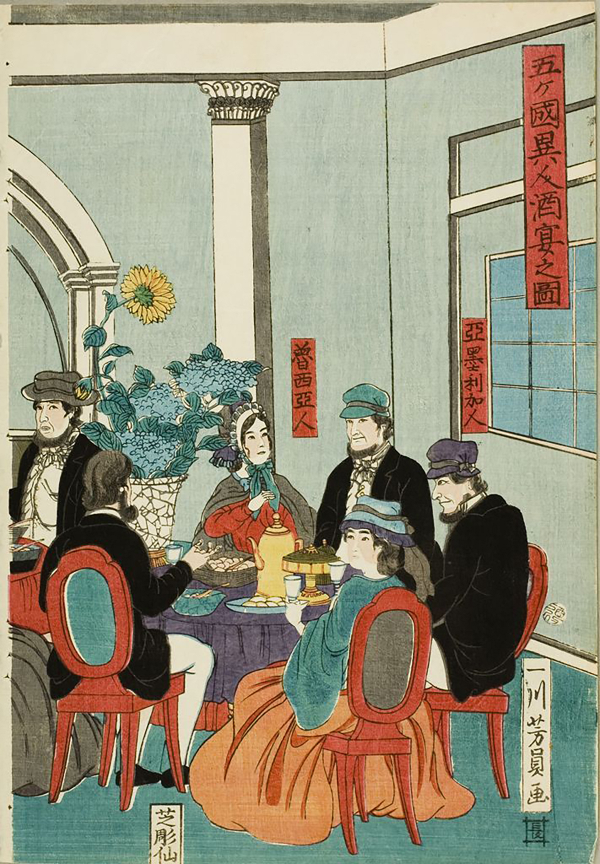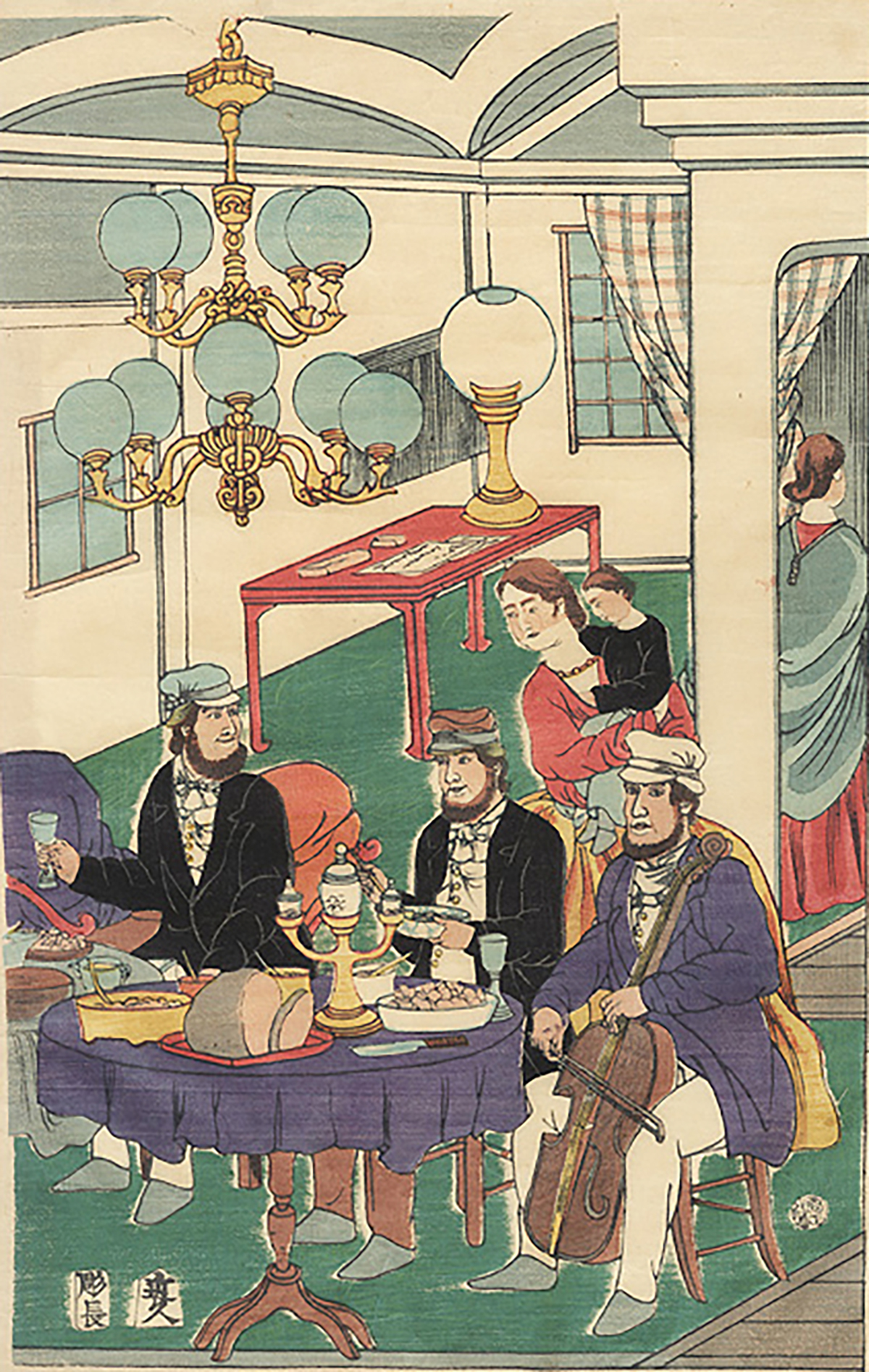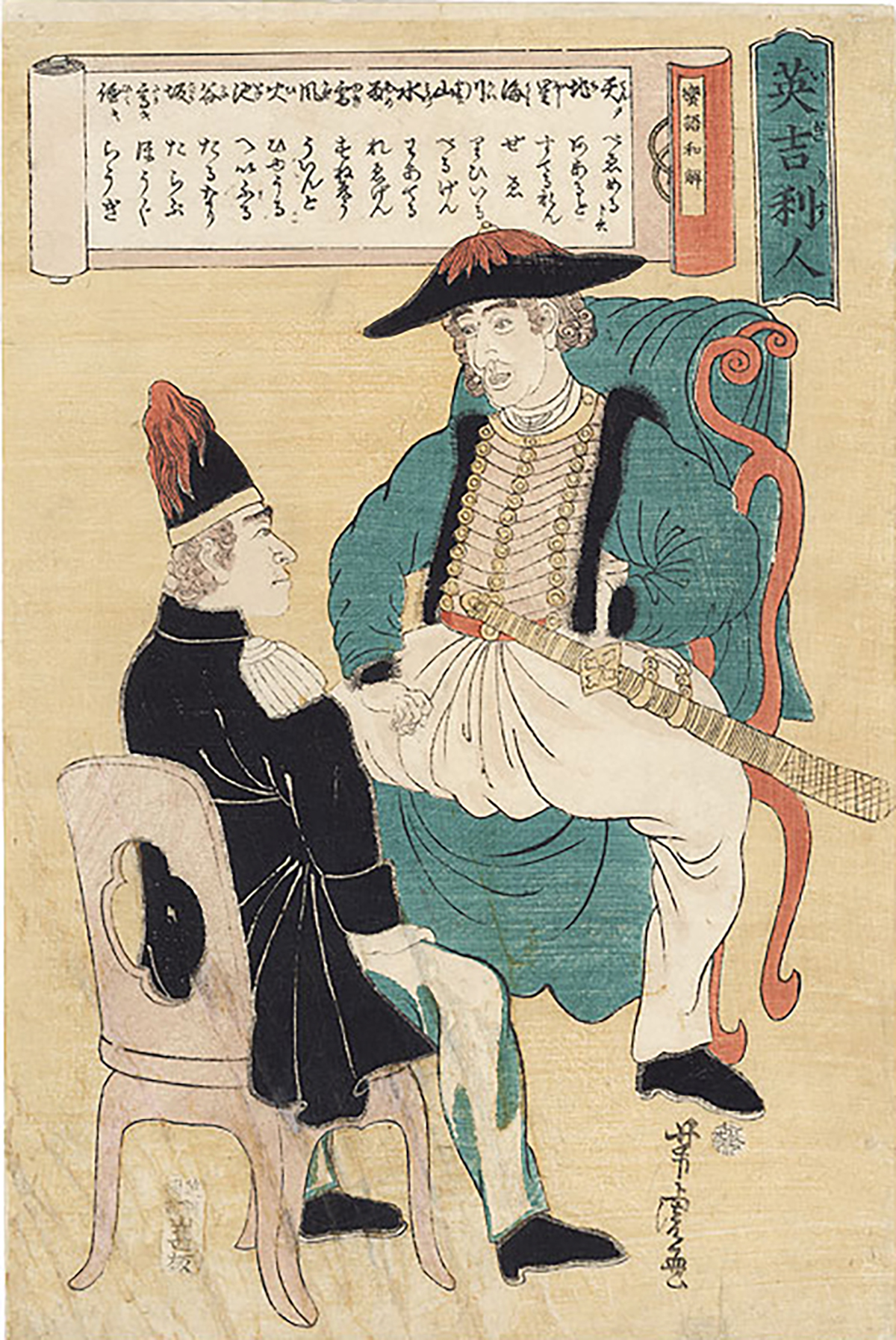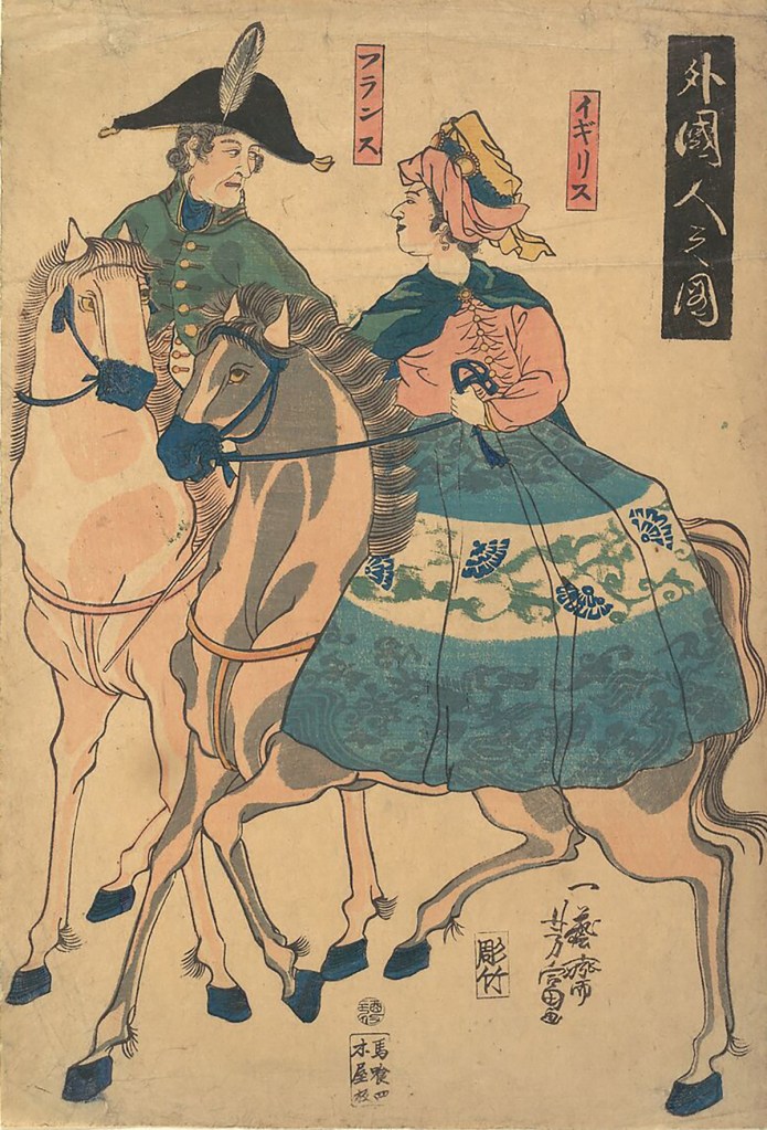 As you can imagine, catching sight of these strange beings kindled intense curiosity in ordinary citizens. Always looking for the next big opportunity, entrepreneurial woodblock artists took a break from painting the top courtesans, sumo wrestlers and actors of the day, and trekked across the Dejima bridge to sketch the outlandish appearance and customs practiced by the foreign barbarians. Needless to say, they made a killing.