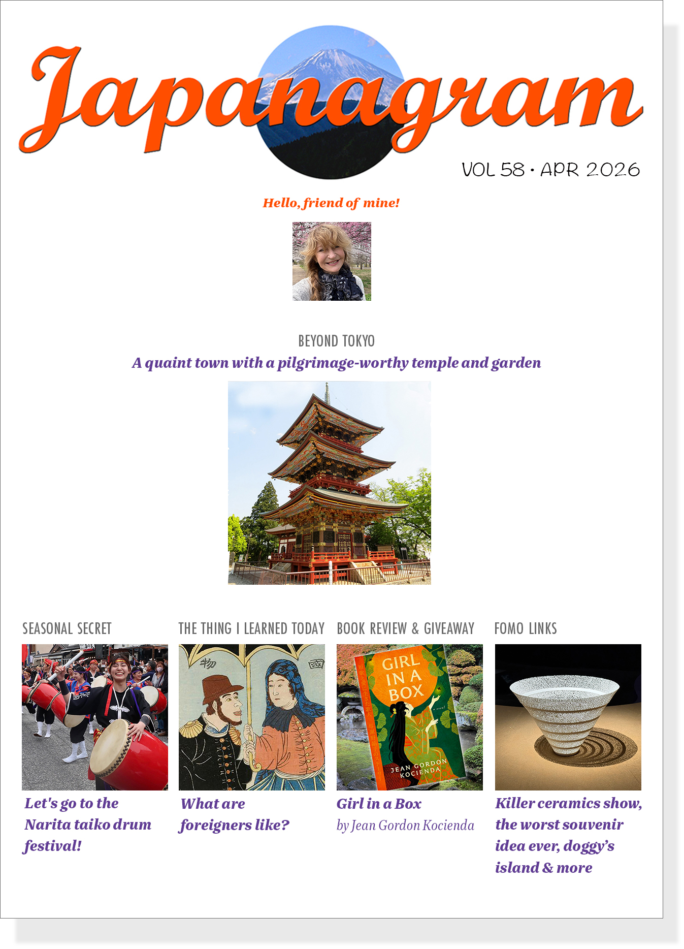 Jonelle Patrick writes novels set in Japan, produces the monthly Japanagram newsletter, and blogs at Only In Japan and The Tokyo Guide I Wish I’d Had