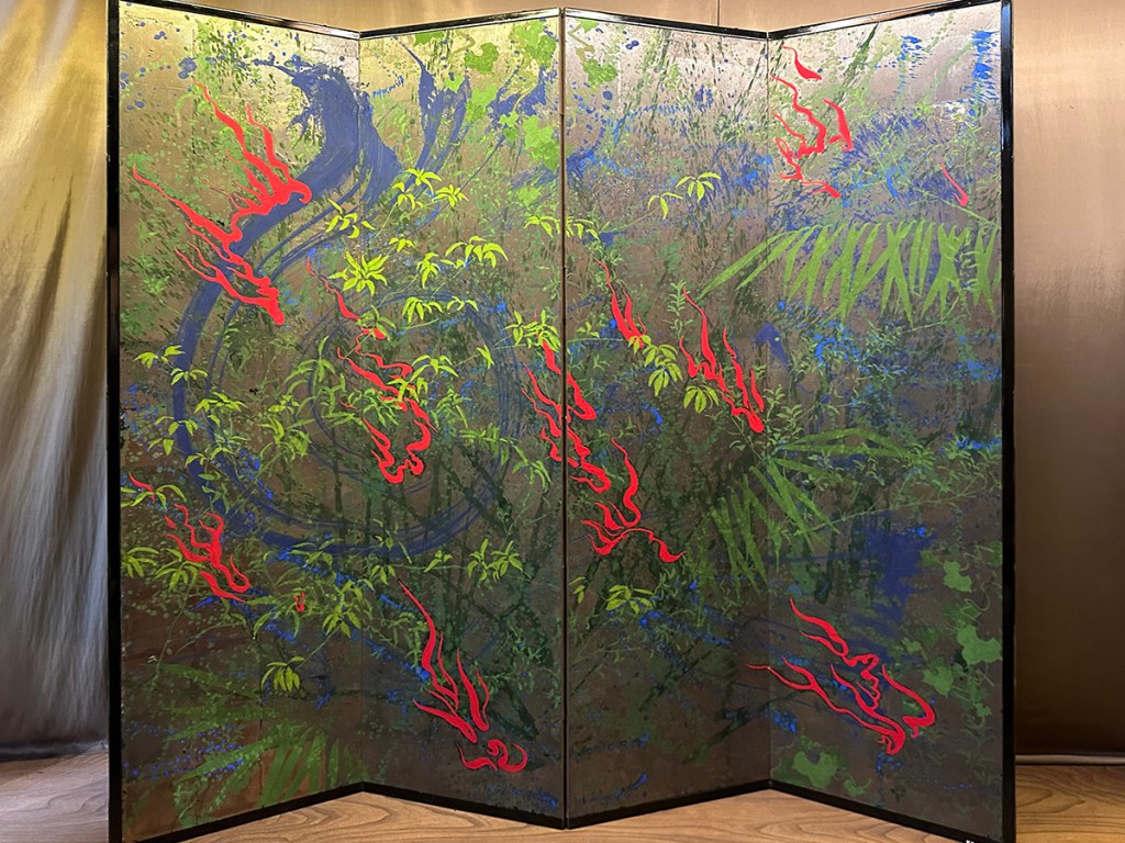 Nihonga paint is unforgivingly opaque. So, why does it look like you can see the plum tree and the gold leaf background through the places where those energetic green elements cross them? Unlike with oils, acrylics and watercolors, the lighter bits that make it look like you’re seeing what’s behind aren’t made by diluting the color or layering the paint—you actually have to find a mineral that’s the right color and paint each and every “overlapping” bit with it.